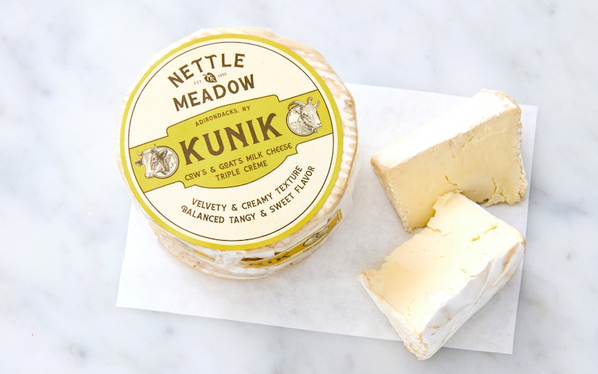 Nettle Meadow Kunik Cheese is a nationally acclaimed triple crème wheel crafted from goat’s milk and cow cream in the foothills of the Adirondacks, New York. This award-winning cheese, recognized by the Good Food Awards in 2018 and 2020, the American Cheese Society in 2010 and 2017, and the World Cheese Championships in 2016, features a delicate white bloomy rind and a tangy, buttery flavor enriched with earthy undertones from its aging in a subterranean cheese cave. Made in small batches and cared for by hand, Kunik embodies true artisan craftsmanship, offering a rich and unique tasting experience.